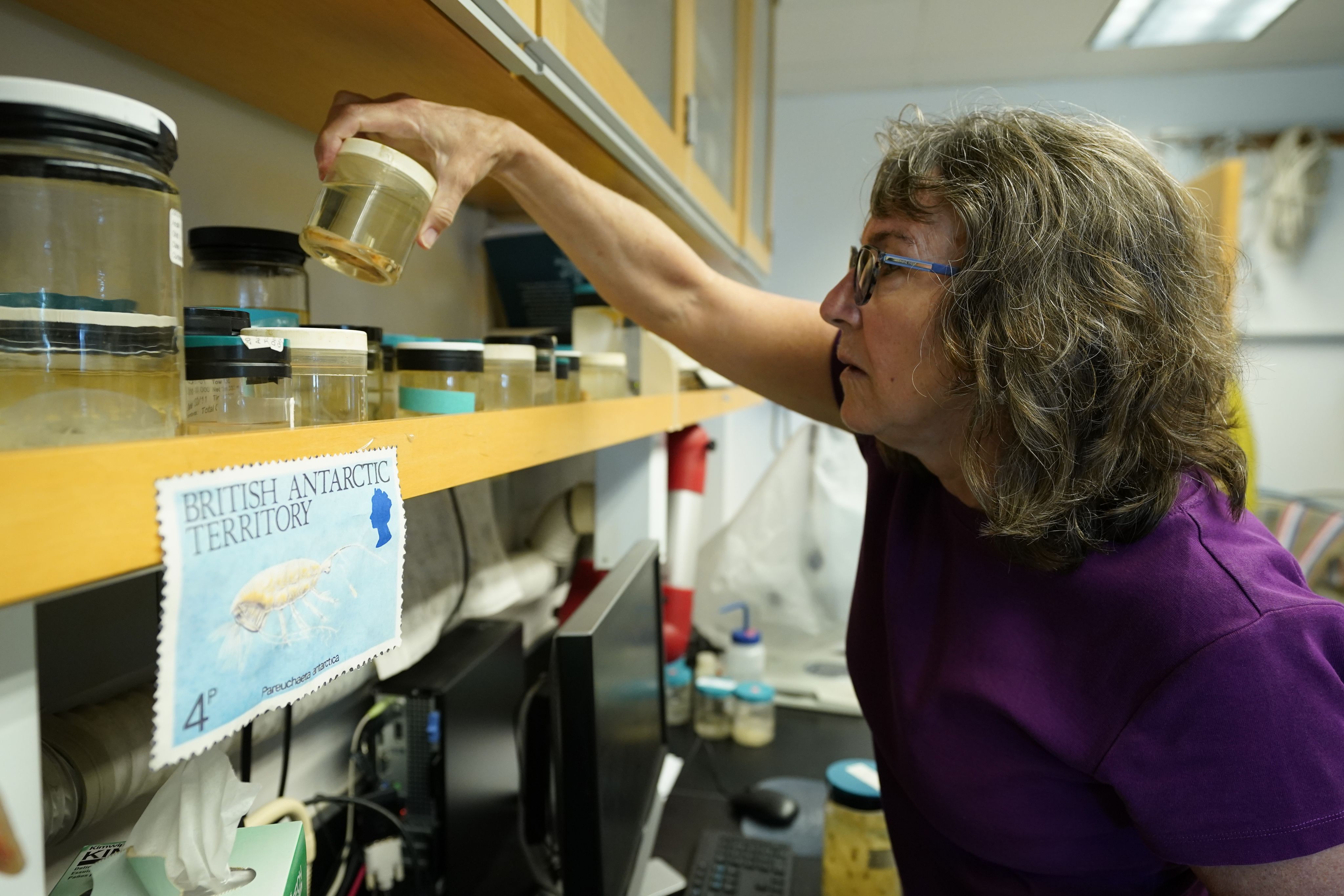 Jars of krill line the windowsills in Deborah Steinberg’s lab, their pink hue faded but their shells intact. Collected on a U.S. icebreaker, they fuel her research at the Virginia Institute of Marine Science. On a recent visit, a technician unscrews one of the jars, empties the formaldehyde and rinses the krill under running water, a dozen fitting in the palm of his hand.